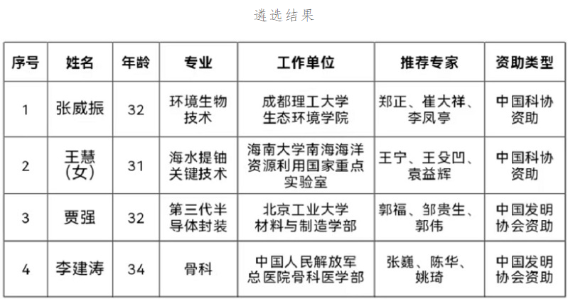 根据《中国科协青年人才托举工程管理办法》和《中国科协青年人才托举工程实施细则(修订)》,按照《中国发明协会“青年人才托举工程”管理办法》及其实施细则等有关规定,中国发明协会2023年9月21日在北京召开第九届中国科协青年人才托举工程项目被托举人遴选专家评审会,经集体评议决定,张威振、王慧、贾强、李建涛4位青年人才入选中国发明协会青托工程项目被托举人候选人,其中张威振、王慧为中国科协经费资助候选人,贾强、李建涛为中国发明协会经费资助候选人。公示名单如下: