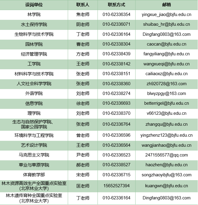 各岗位具体要求及详细信息请登录“北京林业大学人才引进与教师招聘网”查看(https://zhaopinnew.bjfu.edu.cn),岗位将于近期陆续发布。